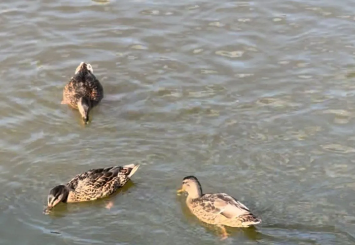 12 крякв впервые остались на зимовку на реке Сайма. Им помогли незамерзающий участок и подкормка горожан.